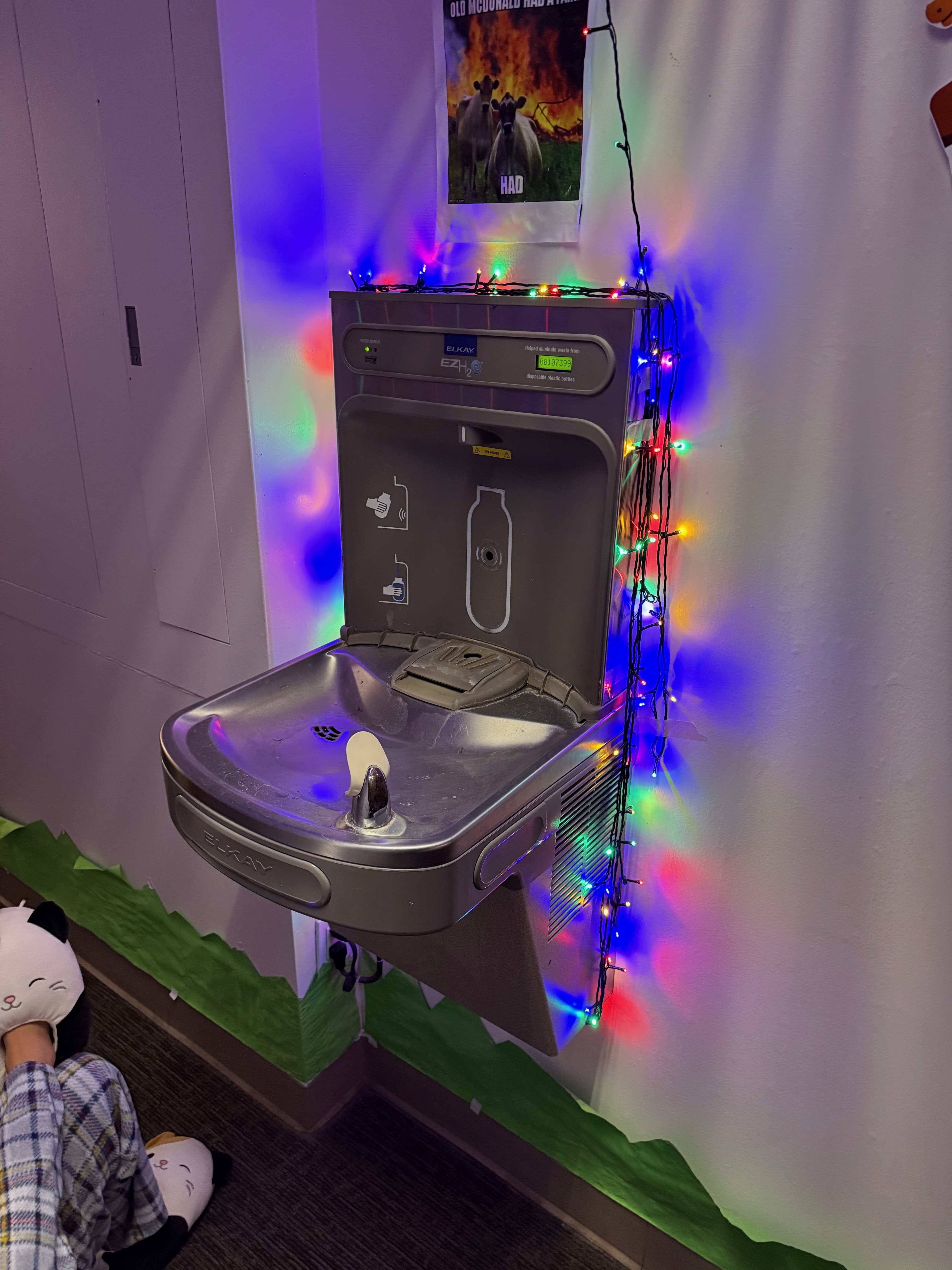 Then, as the clock struck one, it was finally time. Hanging the lights was, frankly, chaos. We had hoped to drape them in a consistent pattern, but this is a lot harder than it seems. If the gaps between your hanging points are too large, then you run out of lights. If they are too small, then you don't have the "string lights" effect. Dialing this in took at least an hour, and since there were three floors (plus the lounge) coordinating meant running up and down stairs. We had also hoped to do this in silence, which, for eight college students high on excitement, is difficult. There were a few instances where dormmates with… interesting sleep schedules wandered back into the dorm. Most were utterly confused, but they all offered us well wishes before heading to bed.