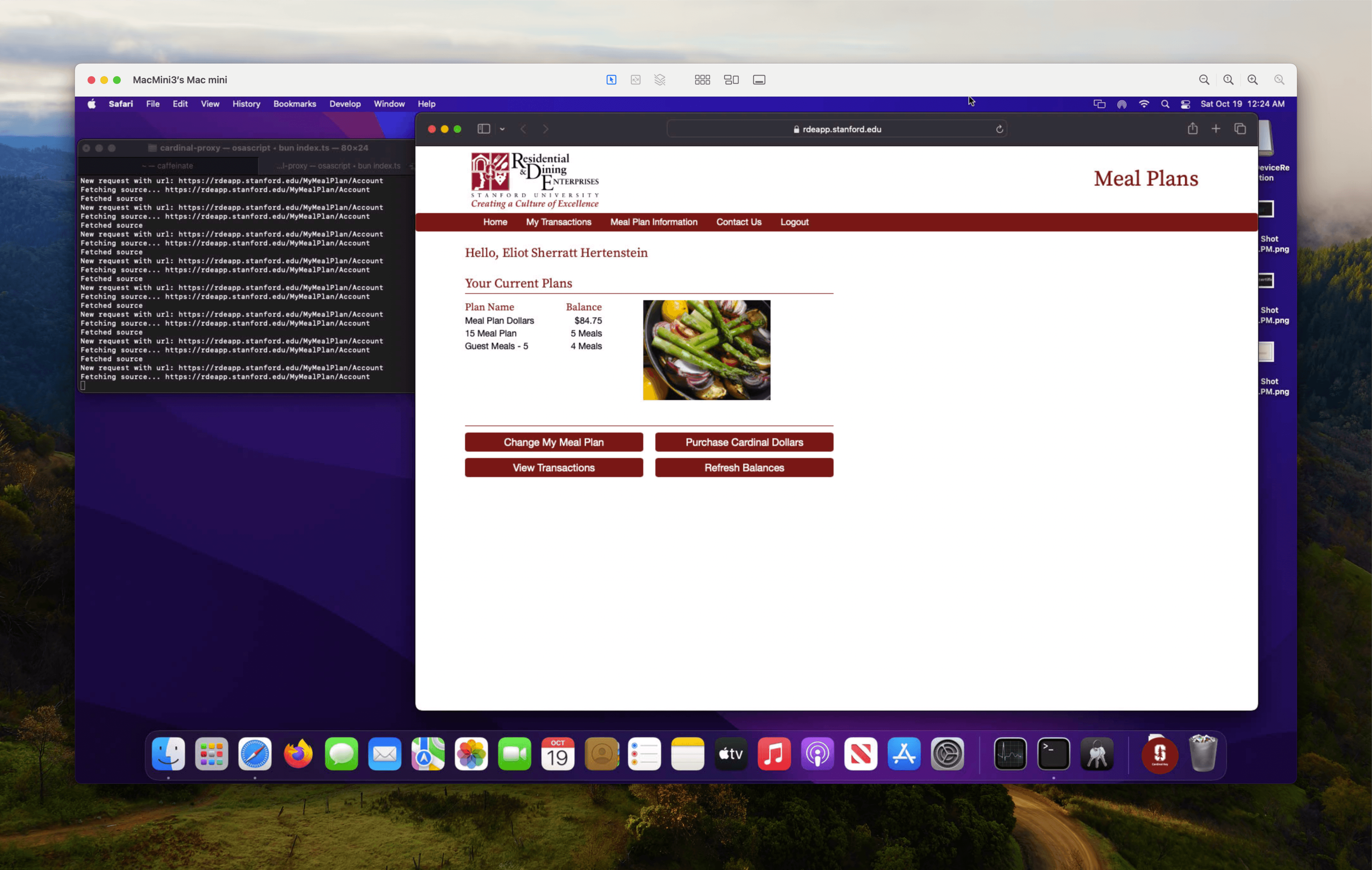 Luckily, Stanford also offers a service called “Cardinal Key” which allows users to bypass the Stanford login by trusting a root certificate. By combining this with some sort of browser automation (for reasons I’ll get into in a minute) I figured I could bypass the login page and access my own dining plan information programatically.